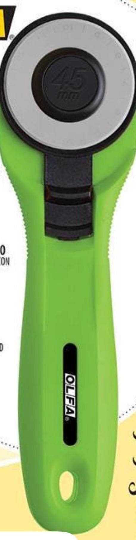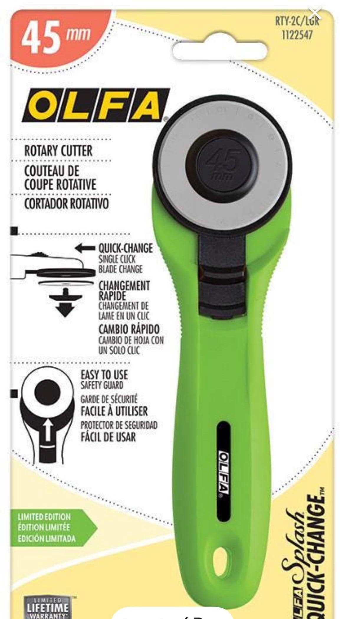 45mm blade, contoured handle for comfort. Cuts right or left handed, quick change blade that is covered in the closed position for safety. Non-slip grooves on handle.