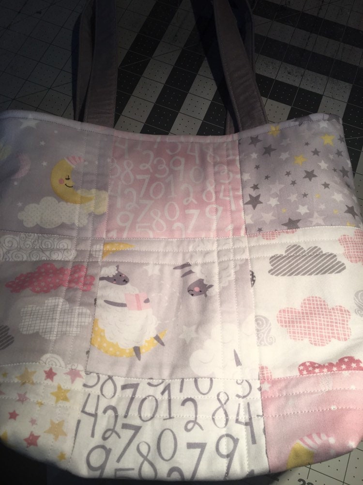 Ask a questionThis adorable bag is perfect for any occasion and is the perfect size for a small diaper bag. I quilted the bag on my sewing machine. The bag is fully lines and the handles are 20 inches long. You will love this fun, handmade bag. The bag is 12 X 5 X 12.